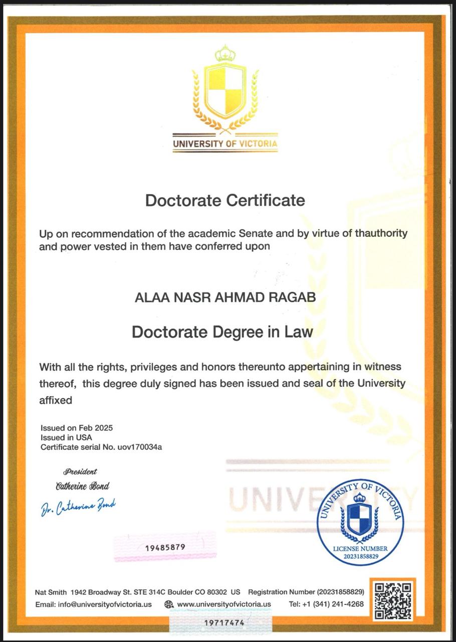 A testament to profound academic mastery and legal expertise. Dr. Alaa Nasr Ahmad Ragab holds a Doctorate Degree in Law, awarded based on the recommendation of the academic senate for his distinguished research and legal contributions. This high-level qualification ensures that our clients receive strategic legal counsel backed by deep academic knowledge and international standards."