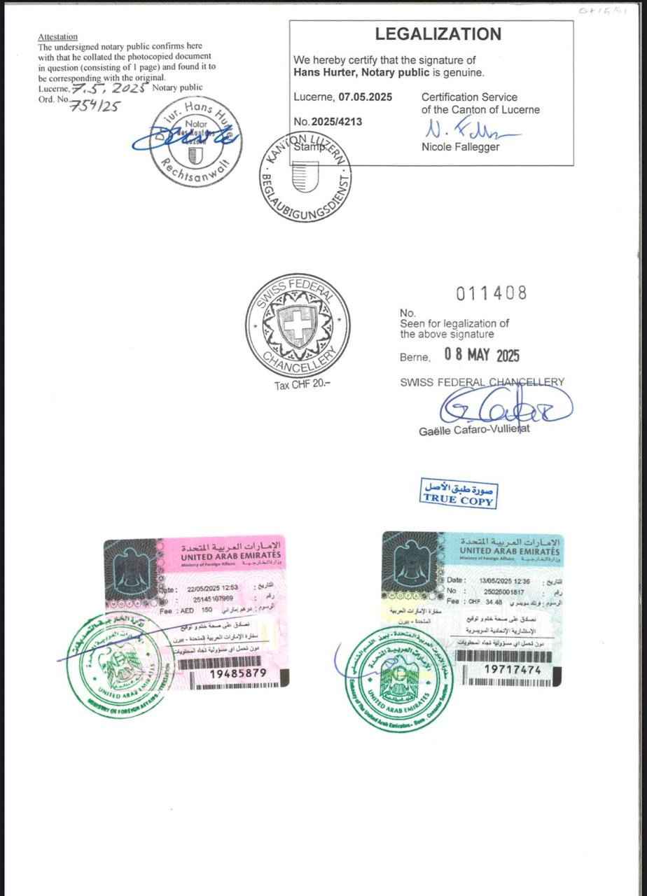 Our credentials are held to the highest global standards. This document confirms the official legalization and authentication of Dr. Alaa Nasr’s professional certificates by the Swiss Federal Chancellery and the UAE Ministry of Foreign Affairs. These international stamps of approval reflect our commitment to transparency, legitimacy, and global excellence in legal practice."