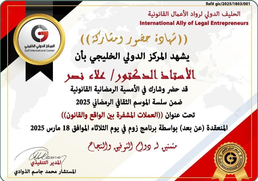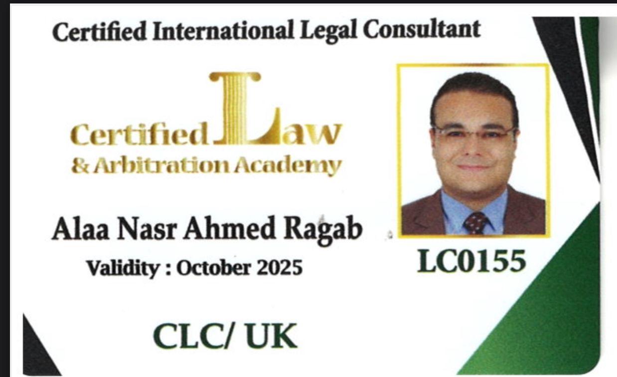 Dr. Alaa Nasr is a recognized 'Certified International Legal Consultant,' credentialed by the Certified Law & Arbitration Academy (CLC/UK). This professional certification reflects his expertise in international law and arbitration, ensuring that our clients receive high-level legal guidance that meets global standards and professional excellence."