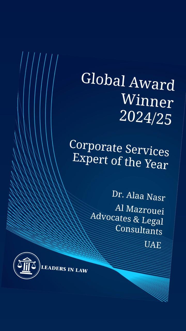 Proudly recognized as the 'Global Award Winner 2024/25' for Corporate Services Expert of the Year by Leaders in Law. This accolade celebrates Dr. Alaa Nasr’s exceptional proficiency in corporate legal structures and strategic advisory. It reaffirms our position as a leading authority in providing expert legal solutions for businesses within the UAE and beyond.
