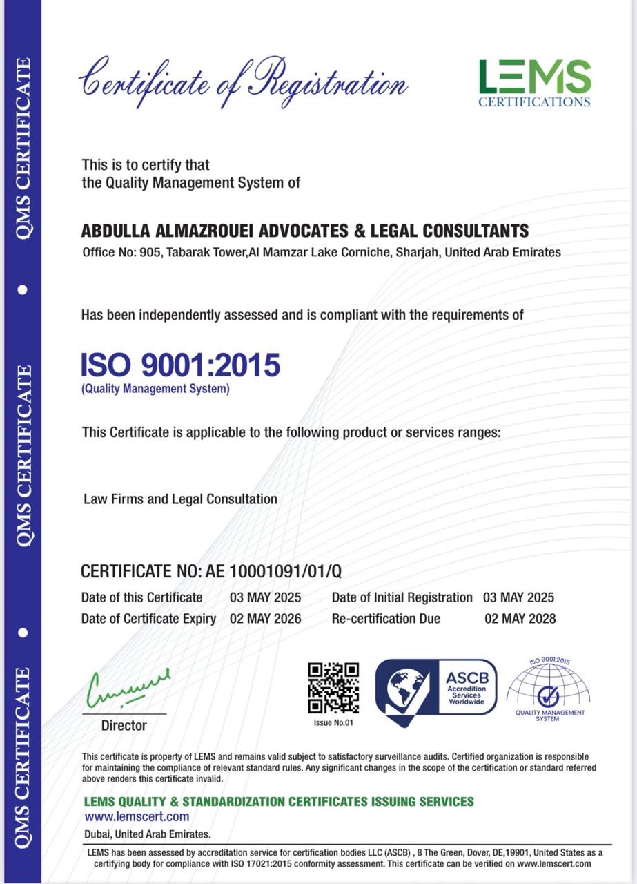 Our commitment to excellence is officially certified. Abdulla Almazrouei Advocates & Legal Consultants is proud to be ISO 9001:2015 certified, an international benchmark for Quality Management Systems. This accreditation ensures that our legal services and office operations meet rigorous global standards, providing our clients with consistent quality, transparency, and professional reliability."