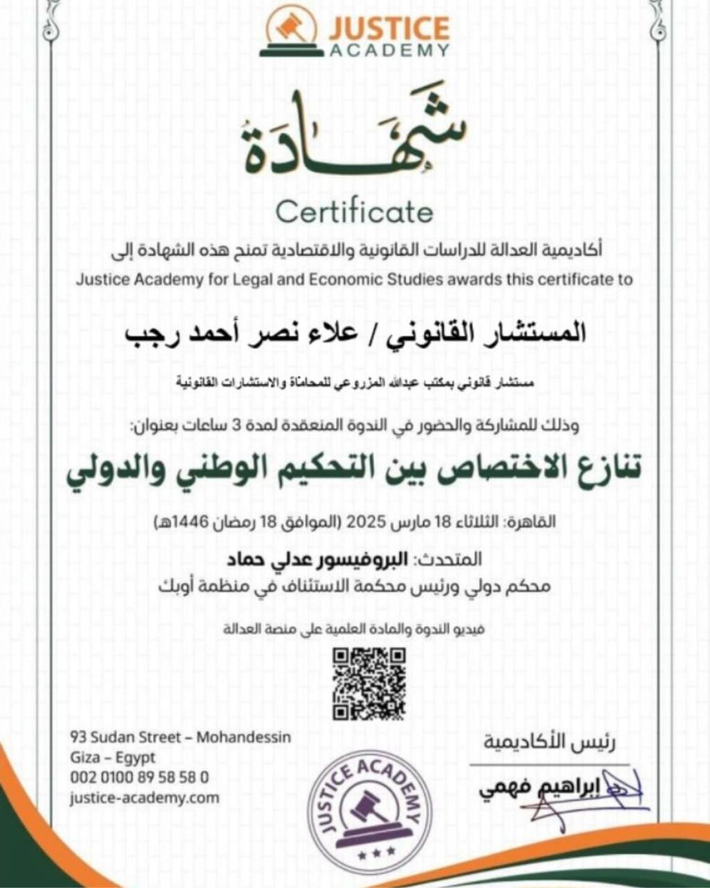 Demonstrating deep expertise in complex legal procedures, Dr. Alaa Nasr is certified by the Justice Academy for Legal and Economic Studies for his specialized work in 'Jurisdictional Disputes between National and International Arbitration.' This credential highlights our firm’s capability to navigate the intricate boundaries of arbitration law, ensuring strategic protection for our clients in both domestic and global forums .