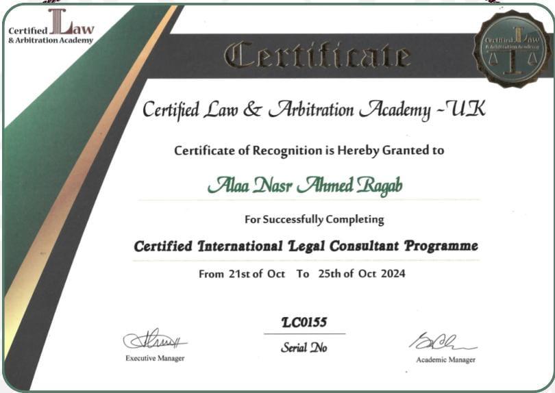 Recognized by the Certified Law & Arbitration Academy - UK, Dr. Alaa Nasr has successfully completed the 'Certified International Legal Consultant Programme.' This credential highlights his specialized training in international legal frameworks and his commitment to professional excellence, ensuring that our clients benefit from globally-standardized legal advice
