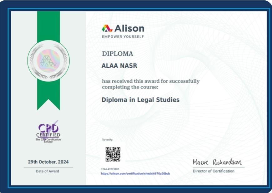Refining legal expertise through continuous education. Dr. Alaa Nasr holds a 'Diploma in Legal Studies,' a CPD-certified credential that underscores his dedication to staying updated with the latest legal principles and academic research. This commitment to lifelong learning ensures our clients benefit from modern, well-rounded legal perspectives